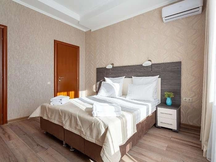 в номере есть все, для комфортного проживания: двуспальная кровать «King Size», диван, кресло-кровать, прикроватные тумбы, шкаф для одежды, электрический чайник, холодильник, набор посуды, сплит-система, сейф, телефонная связь, телевизор с плоским экраном, бесплатный Wi-Fi. Собственная ванная комната: душевая кабина, фен, гигиенические принадлежности, полотенца, халат, тапочки. На балконе стол и два стула.